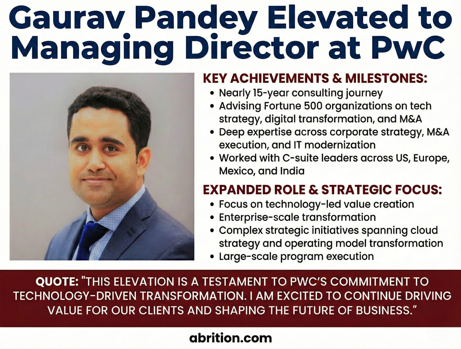 In a significant move that underscores its commitment to technology-driven growth and strategic transformation, PwC has announced the elevation of Gaurav Pandey to the position of Managing Director. This promotion marks a pivotal moment in Pandey’s nearly 15-year consulting career, recognizing his extensive contributions to advising Fortune 500 organizations on complex technology strategies, digital transformations, and high-stakes Mergers and Acquisitions (M&A).